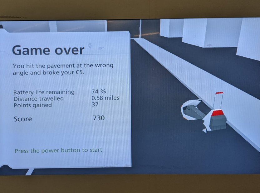 The immersive simulation – which has you sit in a fake C5 replica – offers the challenge of navigating your way through a dystopic portrayal of Glasgow, avoiding potholes, dodging motorbikes and picking up “upgrades” that do nothing at all. I got through most of the course, successfully dodging an array of hazards, only to lose at the last second when I hit the pavement wrong and destroyed my vehicle. The entire thing is just one long dunk on Sir Clive.